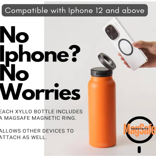 Soporte seguro para teléfono, Compatibilidad MagSafe para dispositivos electrónicos, fácil fijación, Aislamiento para 12 horas caliente, frío 24 horas con cualquier dispositivo: la fuerte tecnología magnética de Xyllo funciona con los modelos MagSafe y iPhone 12 y superiores. Para dispositivos no compatibles con imanes, utiliza el anillo magnético Xyllo Booster Ring (incluido con cada botella).
